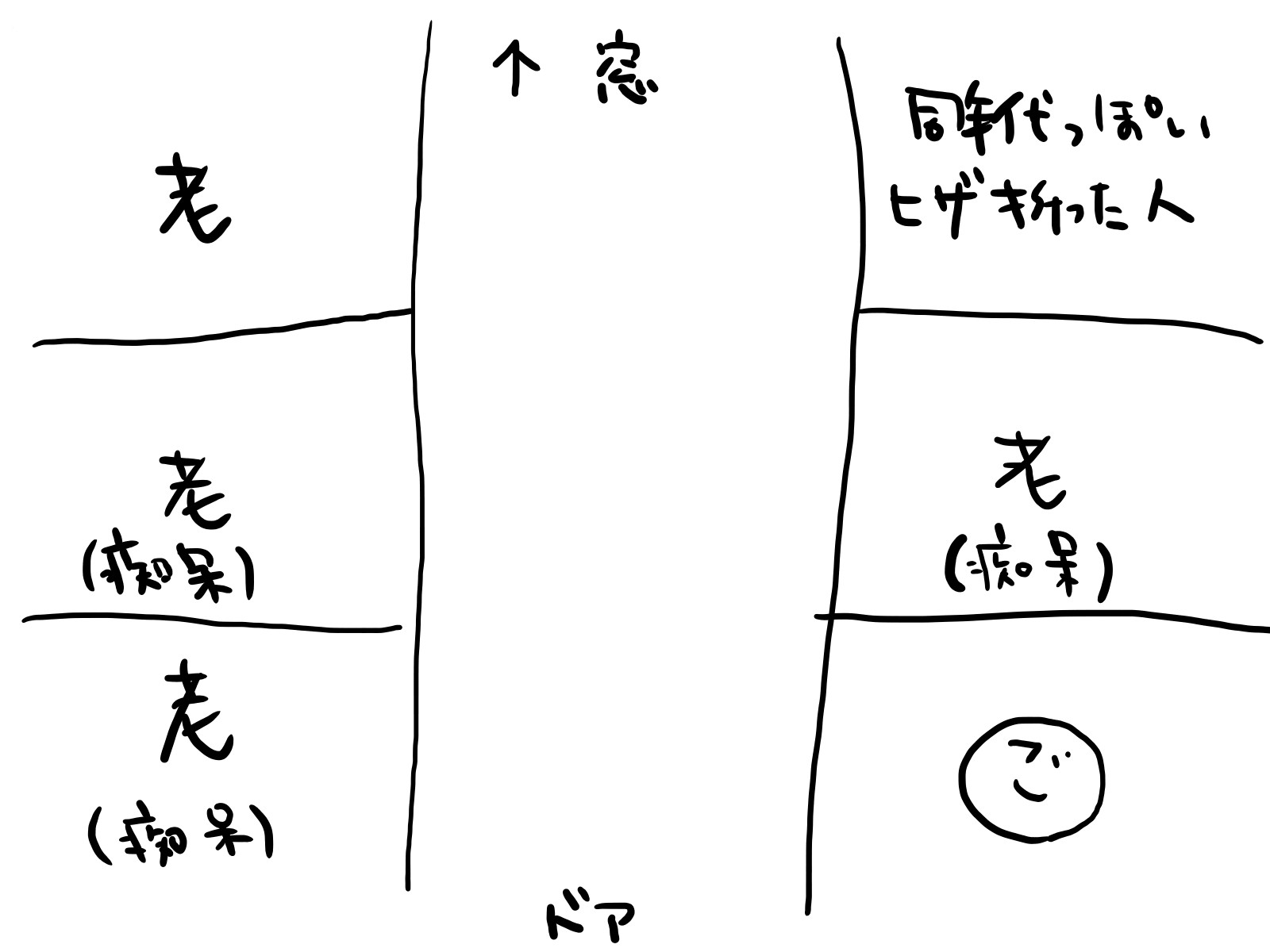 「おじいちゃんばっかりの部屋だけど我慢してね」